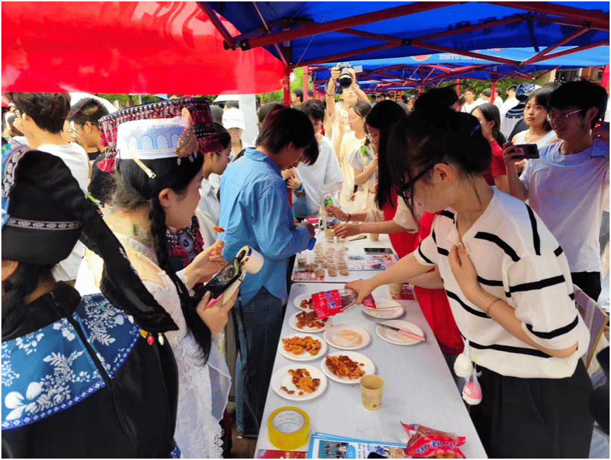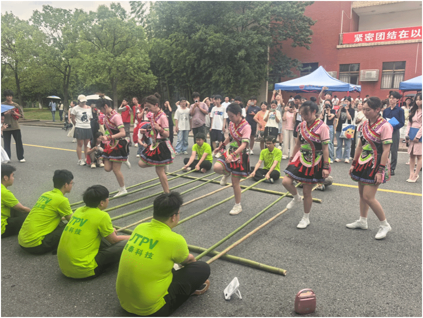 与此同时,趣味游园会也在火热进行,各民族特色活动精彩纷呈,令人应接不暇。数计学院与新能源学院联合组织了操扛、竹竿舞、摘柿子等传统体育游戏,同学们在“摘柿子”游戏里模拟民族传统劳作、在“竹竿舞”的明快节奏里体验非遗活动的活力、在“操扛”竞技中比拼力量与默契,体验不同民族文化的独特魅力;体育学院开展的板鞋竞速、竹竿舞、高脚竞速等项目引来阵阵欢笑与加油声,大家亲身体验传统运动的魅力;公共卫生与健康学院的美食品鉴区人气十足,五色糯米饭、萨其马、酸汤等各民族特色美食吸引师生驻足品尝,舌尖上的民族情悄然传递;手工艺体验区同样热闹非凡,经管学院、建筑与设计学院开展的顶碗竞走、背篓投球、滚铁环、射箭等互动项目,让大家在游戏中感受不同民族的生活智慧与文化韵味。